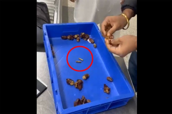 దాంతో ఆ పండ్లలో బంగారు ముక్కలను అమర్చినట్లు గుర్తించారు. ఆ ఖర్జూర పండ్ల బ్యాగ్లో ఒక బంగారు చైన్ ను కూడా అధికారులు గుర్తించారు. ఖర్జూర పండ్లలో దాచిన ఆ బంగారం మొత్తం 172 గ్రాములు ఉన్నట్లు అధికారులు తెలిపారు. సదరు వ్యక్తిపై కేసు నమోదు చేసి దర్యాప్తు చేస్తున్నారు.
