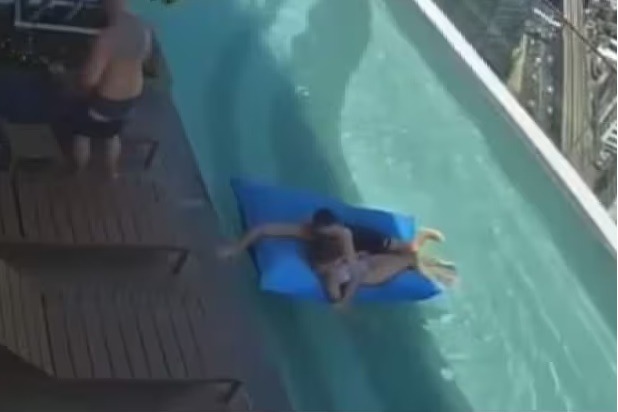 జలపాతంలా కిందకు పడింది. స్విమ్మింగ్ పూల్ లో సునామీ వచ్చినట్లు పరిస్థితి అల్లకల్లోలంగా మారింది. ఈ దృశ్యాలన్నీ అక్కడి సీసీటీవీ కెమెరాలో రికార్డు అయ్యాయి. ప్రస్తుతం ఈ వీడియో సోషల్ మీడియాలో వైరల్ అవుతోంది. ఉన్నట్టుండి బిల్డింగ్ ఊగిపోవడంతో స్విమ్మింగ్ పూల్ అద్దాలు పగిలిపోతాయోనని ఆ జంట భయాందోళనకు గురైంది. వెంటనే వారు స్విమ్మింగ్ పూల్ నుంచి బయటపడటంతో ప్రమాదం తప్పింది. ఆ తర్వాత కొద్ది క్షణాలకే వారు పడుకున్న మ్యాట్ నీటితో పాటు కింద పడిపోవడం వీడియోలో స్పష్టంగా కనిపించింది.