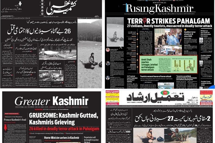 "ఘోరం: కాశ్మీర్ చిధ్రం, కాశ్మీరీలు దుఃఖితులు" అనే ప్రధాన శీర్షికను గ్రేటర్ కాశ్మీర్ పత్రిక తన నల్ల ముఖచిత్రంపై తెల్ల అక్షరాలతో ప్రముఖంగా ప్రచురించింది. దాని కింద ఎరుపు రంగులో "పహల్గామ్‌లో భయంకర ఉగ్రదాడిలో 26 మంది మృతి" అని ఉప శీర్షికను ఇచ్చింది.