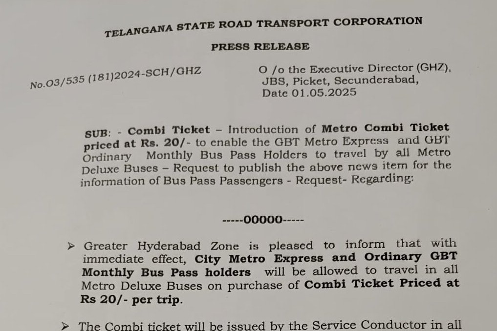 కేవలం 20 రూపాయల అదనపు రుసుము చెల్లించి ఈ కాంబో టికెట్ను పొందితే, ఆ రోజు నగరంలోని అన్ని మెట్రో డీలక్స్ బస్సు సర్వీసులలో ప్రయాణించవచ్చు. ఈ నూతన విధానం వివరాలను టీజీఎస్ఆర్టీసీ మేనేజింగ్ డైరెక్టర్ వీసీ సజ్జనార్ 'ఎక్స్' వేదికగా వెల్లడించారు.