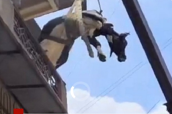 వామ్మో ఇదేం సీన్: మూడో అంతస్తు ఎక్కిన ఆవు... క్రేన్తో కిందకు దించారు!