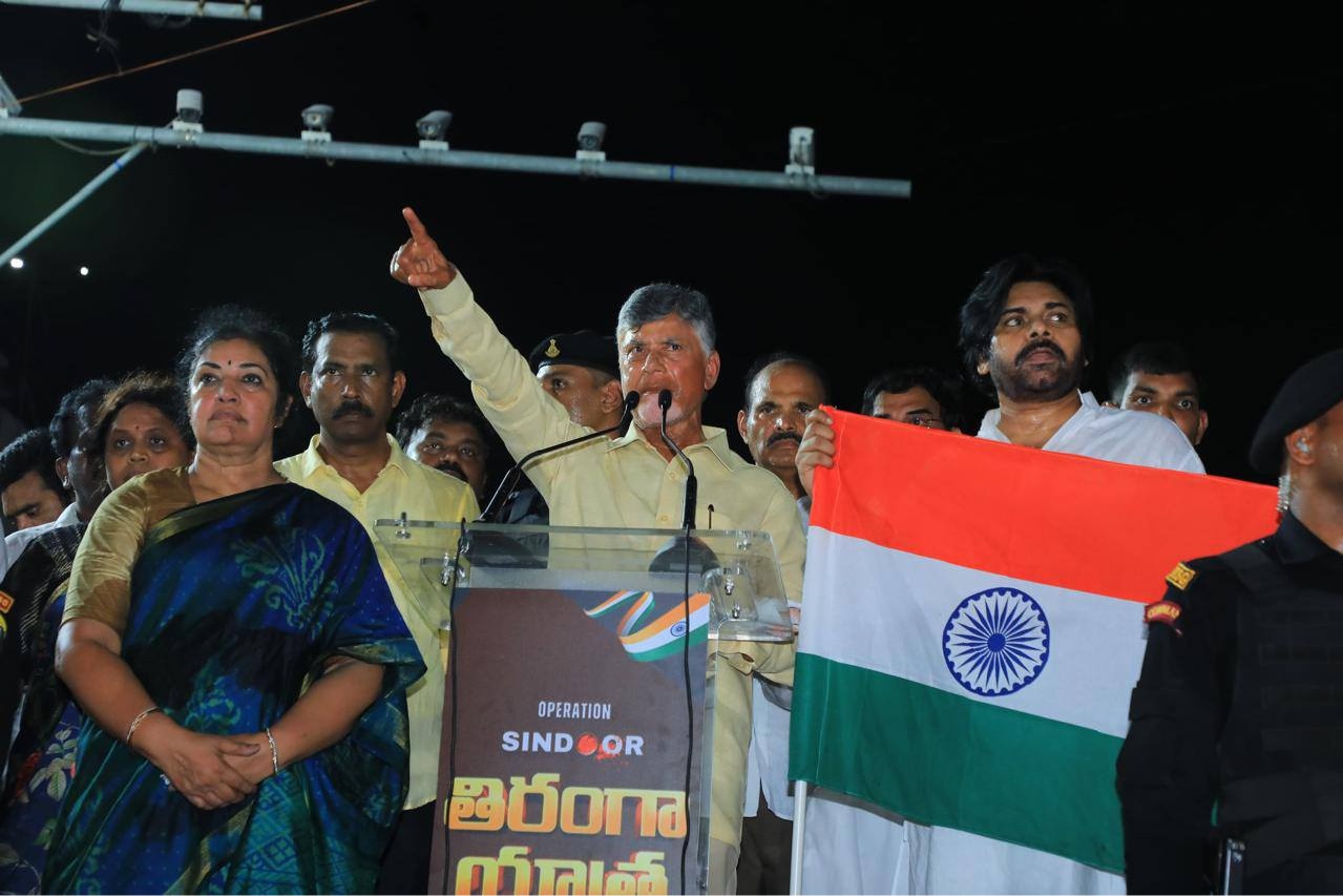 మహిళల నుదుట సింధూరాన్ని తుడిచిన ఉగ్రవాదులకు ఆపరేషన్ సిందూర్ తో ధీటుగా బదులిచ్చామని ఏపీ సీఎం చంద్రబాబు అన్నారు. భారత్ పై తమ ఆటలు సాగవని పాకిస్థాన్ గ్రహించాలని, మన దేశంపై దాడి చేస్తే అదే వారికి చివరి రోజు అవుతుందన్నారు. ఉగ్రవాదంపై అలుపెరుగుని పోరాటం చేస్తున్న సైనికులకు సెల్యూట్ చేస్తున్నానన్నారు. మోదీ రూపంలో దేశానికి సమర్థవంతమైన నాయకుడు లభించాడని, ఉగ్రవాదం అంతు చూడాలని ప్రధాని సంకల్పించారని అన్నారు. ఆపరేషన్ సిందూర్ విజయవంతమైన సందర్భంగా విజయవాడలో నిర్వహించిన తిరంగా ర్యాలీలో సీఎం చంద్రబాబు , జనసేన అధ్యక్షుడు, డిప్యూటీ సీఎం పవన్ కల్యాణ్, ఏపీ రాష్ట్ర బీజేపీ అధ్యక్షురాలు దగ్గుబాటి పురందేశ్వరి, పలువురు మంత్రులు, ఎమ్మెల్యేలు పాల్గొన్నారు. ఈ సందర్భంగా సీఎం చంద్రబాబు మాట్లాడుతూ...