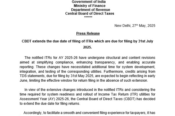 - ఆదాయపు పన్ను రిటర్నుల దాఖలు గడువు పెంపు