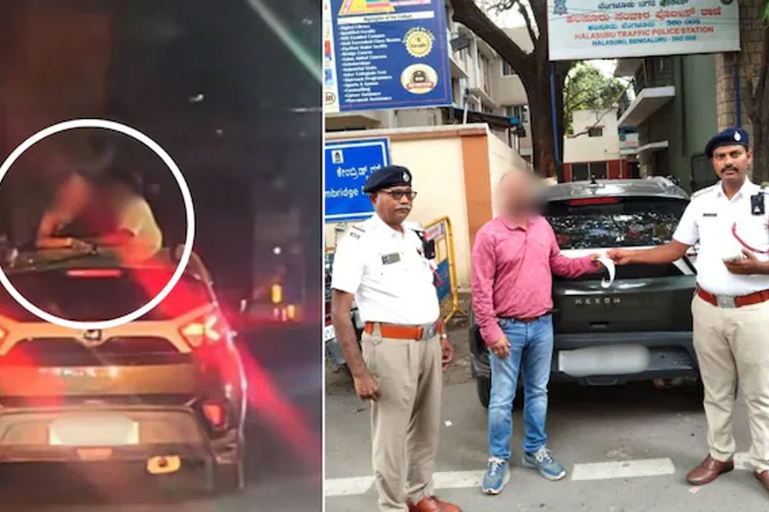 బెంగళూరులో ఓ జంట కదులుతున్న కారు సన్‌రూఫ్ నుంచి బయటకు వచ్చి అనుచితంగా ప్రవర్తించిన ఘటన ఒకటి వెలుగులోకి వచ్చింది. ఈ సంఘటనకు సంబంధించిన వీడియో సోషల్ మీడియాలో వైరల్ కావడంతో, ట్రాఫిక్ పోలీసులు రంగంలోకి దిగి ఆ జంటకు జరిమానా విధించారు.