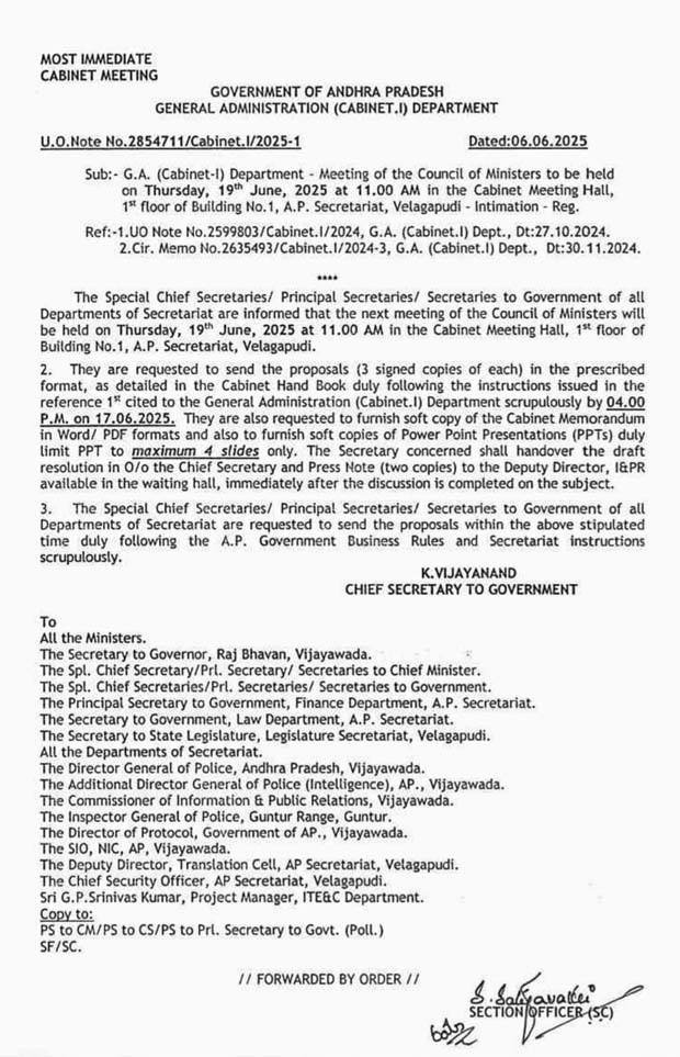 ఈ నేపథ్యంలో, 17వ తేదీ సాయంత్రం 4 గంటలలోపు అన్ని శాఖల కార్యదర్శులు కేబినెట్ సమావేశానికి సంబంధించిన ప్రతిపాదనలను సమర్పించాలని ఆదేశించారు. ఈ నెల 4న జరిగిన కేబినెట్ సమావేశంలో పలు కీలక ప్రతిపాదనలకు ఆమోదం లభించింది.