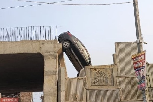• నిర్మాణంలో ఉన్న ఫ్లైఓవర్‌పైకి దూసుకెళ్లి వేలాడిన వాహనం