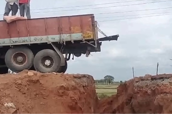 సూర్యాపేట జిల్లా మేళ్లచెరువు మండలంలోని కందిబండ సమీపంలో జూన్ 15 ఆదివారం రాత్రి ఈ ఆశ్చర్యకరమైన సంఘటన జరిగింది. మేళ్లచెరువులోని ఓ సిమెంట్ కంపెనీ నుంచి సిమెంట్ బస్తాల లోడుతో బయలుదేరిన లారీ, మేళ్లచెరువు-కోదాడ ప్రధాన రహదారిపై ప్రయాణిస్తోంది. కందిబండ దగ్గర కొత్తగా నిర్మిస్తున్న వంతెన ప్రాంతంలో ఏర్పాటు చేసిన డైవర్షన్ రోడ్డును డ్రైవర్ గమనించలేదు. రోడ్డుపై ఉన్న మట్టిదిబ్బలను దాటుకుంటూ వేగంగా ముందుకు దూసుకెళ్లాడు.
