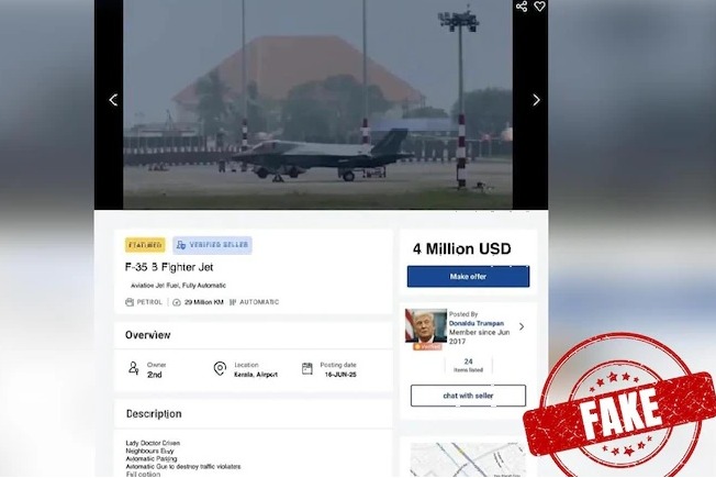 Thu 10:16 ఫైటర్ జెట్ ఫర్ సేల్.. ఓఎల్ఎక్స్ లో పెట్టారంటూ ఫేక్ ఫొటోతో మీమ్స్ సాంకేతిక సమస్యతో కేరళలో నిలిచిపోయిన బ్రిటన్ యుద్ధ విమానం ఎఫ్ 35 ఓఎల్ఎక్స్లో అమ్మకానికి ఉందంటూ నకిలీ ప్రచారం జోరు 40 లక్షల డాలర్ల ధరతో ఫేక్ స్క్రీన్షాట్ వైరల్ సీఐఎస్ఎఫ్ భద్రతలో విమానం, మరమ్మతులు చేస్తున్న నిపుణులు Read full story