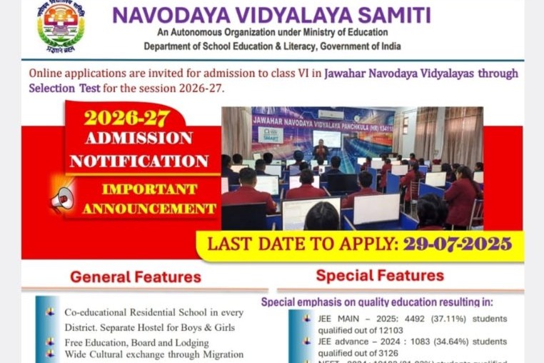 దేశవ్యాప్తంగా ఉన్న జవహర్ నవోదయ విద్యాలయాల్లో 2026-27 విద్యా సంవత్సరానికి ఆరో తరగతిలో ప్రవేశాల కోసం దరఖాస్తు ప్రక్రియ ప్రారంభమైంది. ఆసక్తిగల విద్యార్థులు అధికారిక వెబ్సైట్ ద్వారా జూలై 29వ తేదీలోపు దరఖాస్తు చేసుకోవాలని నవోదయ విద్యాలయ సమితి సూచించింది. నవోదయ పాఠశాలల్లో సీటు సాధిస్తే ఆరో తరగతి నుంచి ఇంటర్మీడియట్ వరకు విద్య, వసతి పూర్తిగా ఉచితంగా లభిస్తాయి.