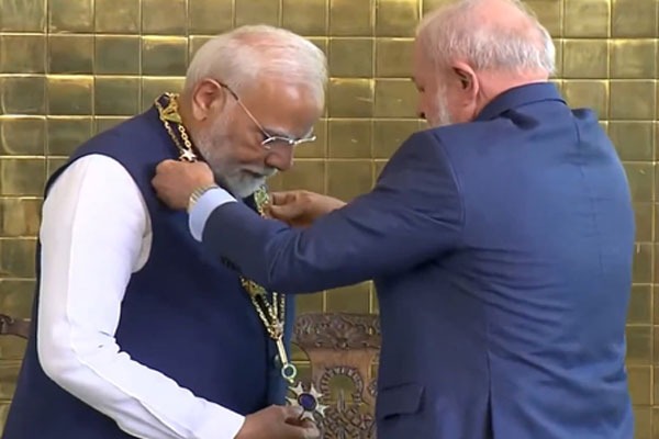 భారత ప్రధాని నరేంద్ర మోదీ తన కీర్తి కిరీటంలో మరో కలికితురాయిని చేర్చుకున్నారు. ప్రపంచవ్యాప్తంగా వివిధ దేశాల నుంచి అందుకుంటున్న పురస్కారాల జాబితాలో తాజాగా బ్రెజిల్ అత్యున్నత పౌర పురస్కారం కూడా చేరింది. తన అధికారిక పర్యటనలో భాగంగా బ్రెజిల్లో ఉన్న ప్రధాని మోదీకి ఆ దేశ అధ్యక్షుడు లూయిజ్ ఇనాసియో లూలా డా సిల్వా మంగళవారం ‘గ్రాండ్ కాలర్ ఆఫ్ ది నేషనల్ ఆర్డర్ ఆఫ్ ది సదరన్ క్రాస్’ పురస్కారాన్ని ప్రదానం చేశారు.