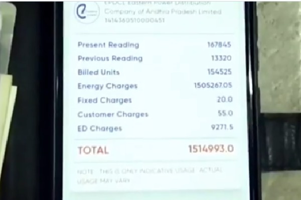 అందులో... 1 లక్షకు పైగా యూనిట్లు వినియోగించినట్టు ఉంది. అందుకు గాను రూ.15,14,993 బిల్లు వచ్చింది. దీనిపై రిటైర్డ్ హెడ్ మాస్టర్ ఆగ్రహం వ్యక్తం చేశారు. లైన్ మేన్ ను అడిగితే, మీటర్ లో లోపం ఉందని, మరో మీటర్ కు అప్లై చేసుకోవలని చెబుతున్నాడని, తాను అలా చేయనని స్పష్టం చేశారు. తాను డబ్బు కట్టి డిజిటల్ మీటర్ తీసుకున్నానని, ఇలాంటి లోపాలతో కరెంటు బిల్లులు వస్తుంటే పేదల పరిస్థితి ఏమిటని ఆయన ఆవేదన వ్యక్తం చేశారు.