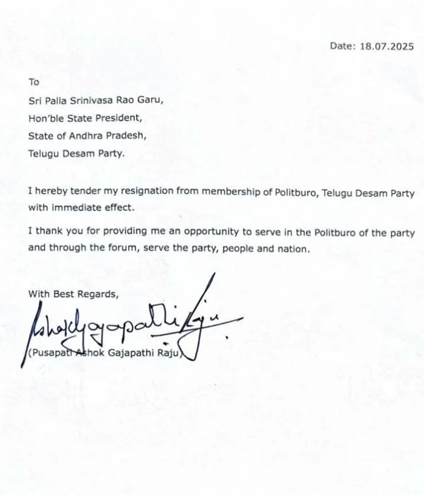 టీడీపీలో ఎన్నో అవకాశాలు అందుకున్నట్లు చెప్పుకొచ్చారు. ఇన్ని అవకాశాలు కల్పించిన పార్టీకి, సీఎం చంద్రబాబుకు అశోక్ గజపతిరాజు ప్రత్యేకంగా ధన్యవాదాలు తెలిపారు. ఇటీవలే ప్రధాని మోదీ, సీఎం చంద్రబాబు తనకు గోవా గవర్నర్గా అవకాశం కల్పించిన నేపథ్యంలో పార్టీకి పార్టీ పదవులకు రాజీనామా చేస్తున్నట్లు తెలిపారు.