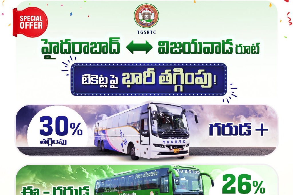 'హైదరాబాద్-విజయవాడ మార్గంలో టిక్కెట్లపై భారీ తగ్గింపు' అంటూ ఒక ప్రకటనను విడుదల చేసింది. గరుడ ప్లస్ బస్సుల్లో టిక్కెట్ ధరపై 30 శాతం, ఈ-గరుడ బస్సుల్లో 26 శాతం ప్రత్యేక తగ్గింపును అందిస్తున్నట్లు తెలిపింది. సూపర్ లగ్జరీ, లహరి నాన్ ఏసీ బస్సుల్లో టిక్కెట్లపై 20 శాతం, రాజధాని, లహరి ఏసీ బస్సుల్లో 16 శాతం వరకు తగ్గింపు ఉంటుందని వెల్లడించింది.