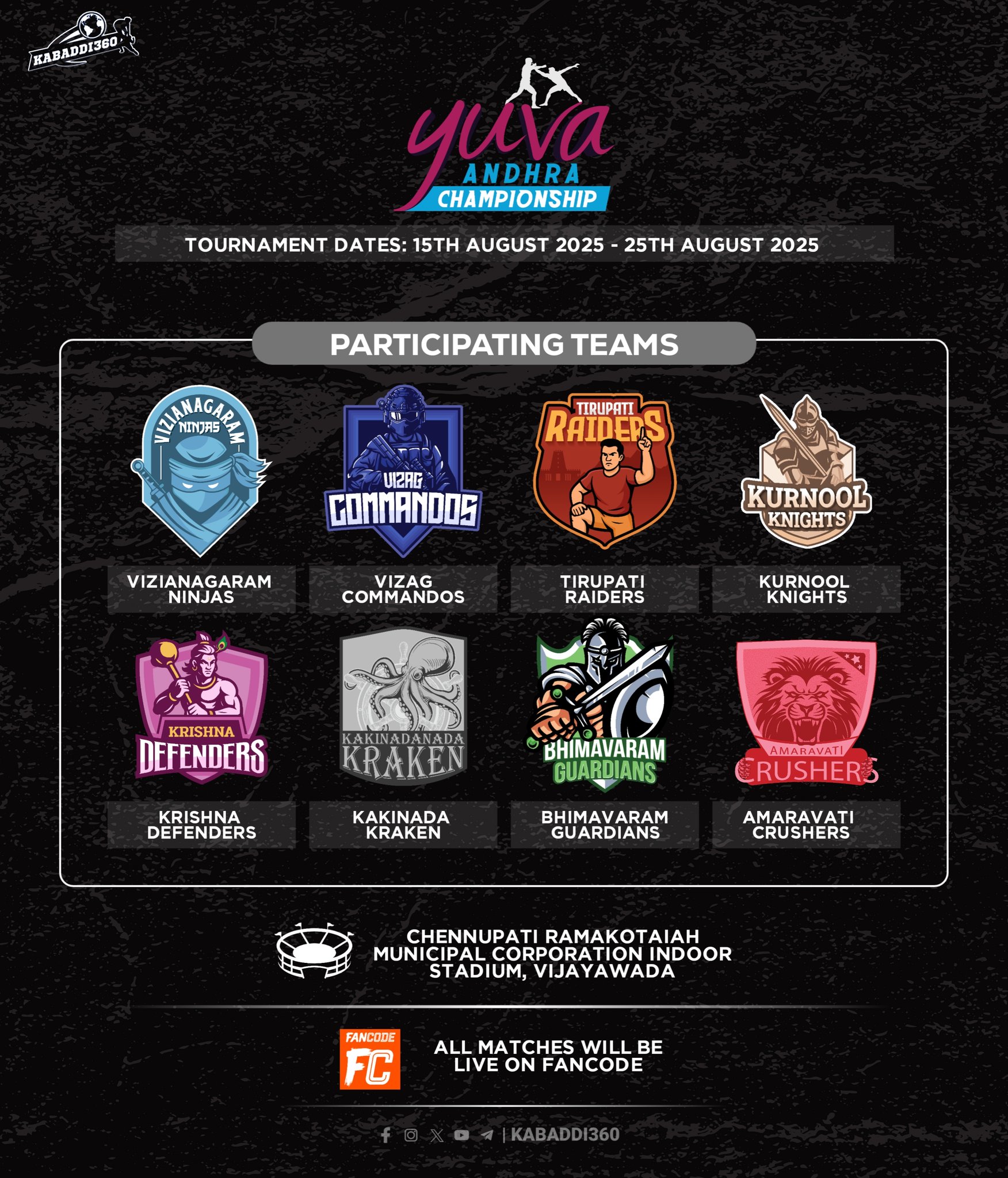 ఆగస్టు 15వ తేదీ నుంచి విజయవాడలోని చెన్నుపాటి రామకోటయ్య మున్సిపల్ కార్పొరేషన్ ఇండోర్ స్టేడియంలో ఈ కబడ్డీ సమరం ప్రారంభం కానుంది. మొత్తం 11 రోజుల పాటు సాగే ఈ టోర్నమెంట్ ఆగస్టు 25న ముగుస్తుంది. ఈ పోటీల్లో ఆంధ్రప్రదేశ్లోని వివిధ ప్రాంతాలకు చెందిన ఎనిమిది జట్లు పాల్గొంటున్నాయి. ఈ జట్ల మధ్య మొత్తం 46 హోరాహోరీ మ్యాచ్లు జరగనున్నాయి. కబడ్డీ ప్రియుల కోసం ఈ మ్యాచ్లన్నీ ఫ్యాన్కోడ్ వేదికగా హిందీ, తెలుగు భాషల్లో ప్రత్యక్ష ప్రసారం కానున్నాయి.