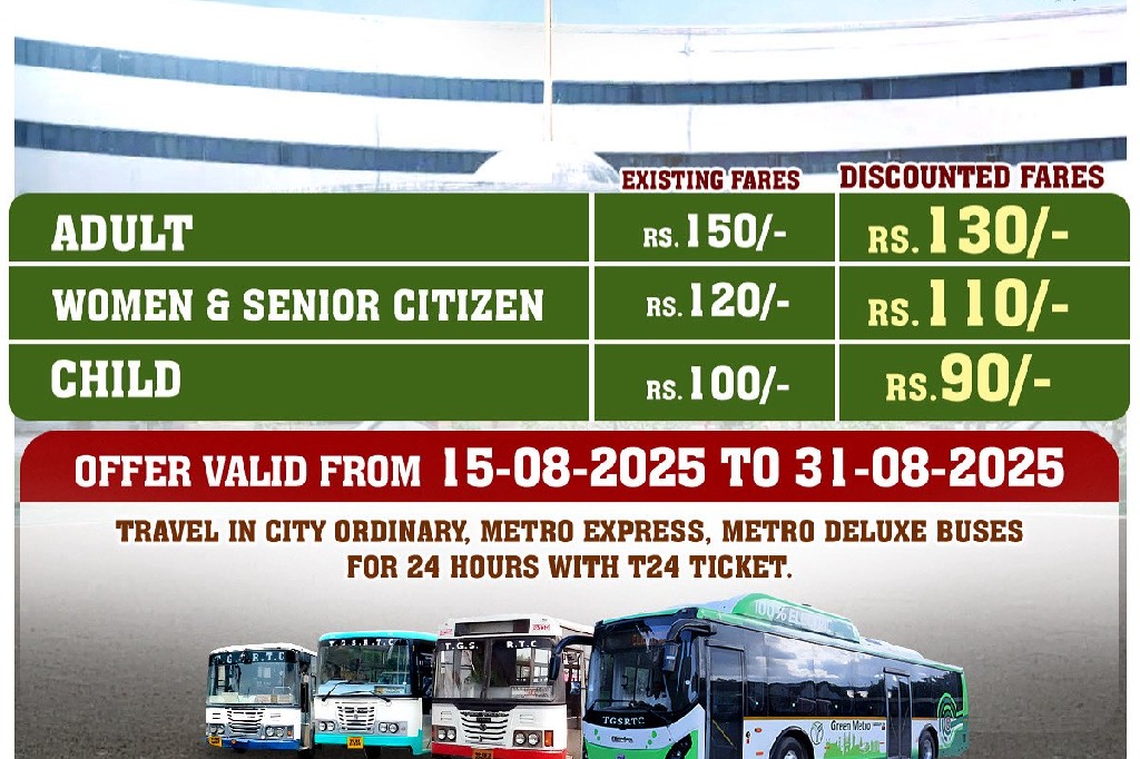 భాగ్యనగర ప్రజలకు టీజీఎస్ఆర్టీసీ శుభవార్తను అందించింది. స్వాతంత్ర్య దినోత్సవం సందర్భంగా 'ఫ్రీడమ్ ఆఫర్' కింద ట్రావెల్ యాజ్ యు లైక్ (టీఏవైఎల్) టిక్కెట్ ధరను తగ్గిస్తూ నిర్ణయం తీసుకుంది. పరిమిత కాలం వరకు మాత్రమే ఈ తగ్గింపు ధర అందుబాటులో ఉంటుంది. ఈ నెల 15 నుంచి 31వ తేదీ వరకు తగ్గింపు ధరలు అందుబాటులో ఉంటాయని సంబంధిత అధికారులు తెలిపారు.