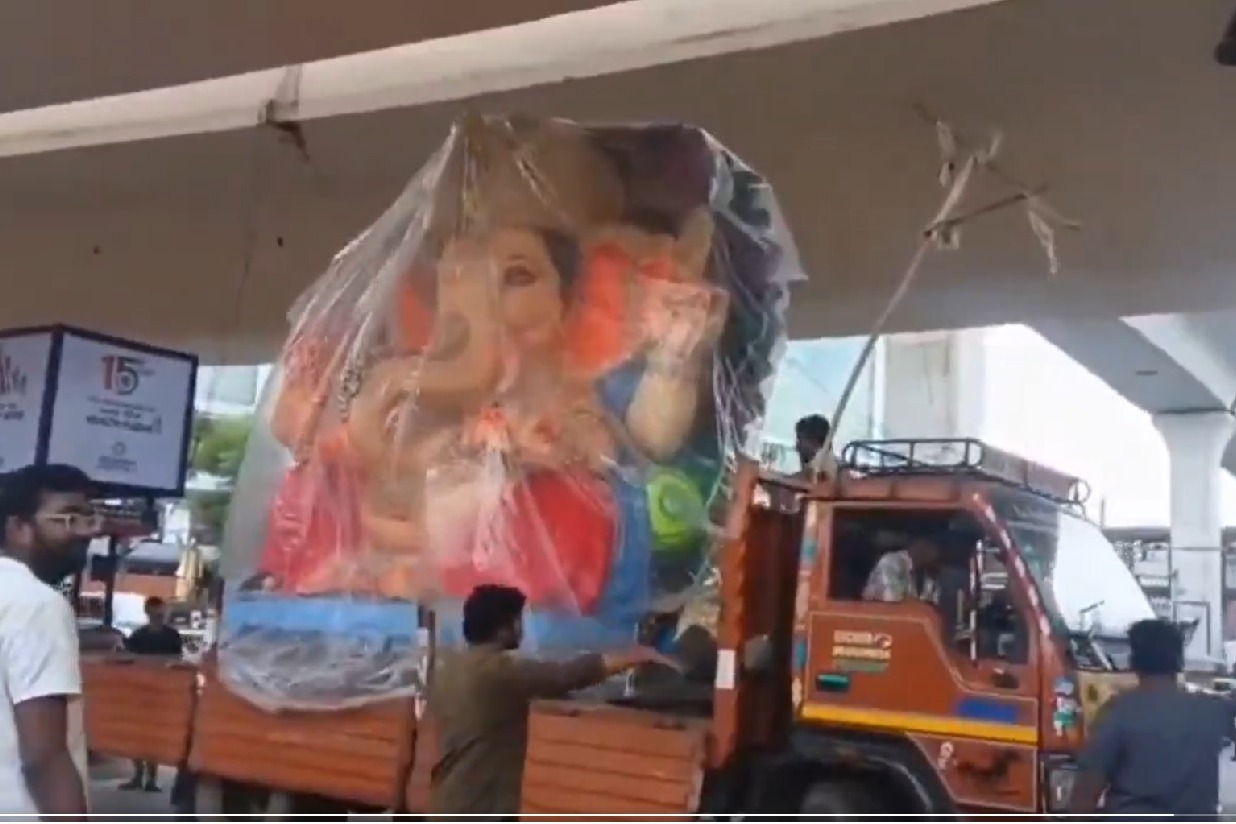 పంజాగుట్ట ఫ్లైఓవర్ కింద ఇరుక్కున్న గణేశుడి విగ్రహం.. వీడియో ఇదిగో!