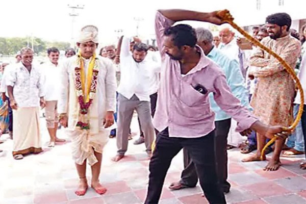 Tue 14:04 అక్కడ వింత ఆచారం.. తాళి కట్టగానే వరుడికి కొరడా దెబ్బలు.. ఎందుకో తెలుసా? వైఎస్సార్ కడప జిల్లాలో ఓ వింత వివాహ సంప్రదాయం పెళ్లిలో వరుడికి తప్పని మూడు కొరడా దెబ్బలు తాళి కట్టిన వెంటనే పెళ్లికొడుకును కొడుతున్న బంధువులు శతాబ్దాలుగా 'బూచుపల్లె' వంశంలో కొనసాగుతున్న ఆచారం గంగమ్మ తల్లి ఆదేశం ప్రకారమేనంటున్న స్థానికులు Read full story