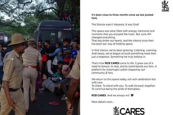 Thu 12:33 అభిమానుల మరణాలపై మౌనం వీడిన ఆర్సీబీ.. 3 నెలల తర్వాత ఫ్యాన్స్కు భావోద్వేగ సందేశం దాదాపు మూడు నెలల తర్వాత సోషల్ మీడియాలో స్పందించిన ఆర్సీబీ జూన్ 4 తొక్కిసలాట ఘటనపై తీవ్ర దుఃఖంలో ఉన్నామన్న ఫ్రాంచైజీ బాధిత అభిమానుల కోసం 'ఆర్సీబీ కేర్స్' అనే కొత్త కార్యక్రమం ప్రకటన ఆ విషాదం మా గుండెల్ని పగలగొట్టిందని భావోద్వేగ పోస్ట్ Read full story