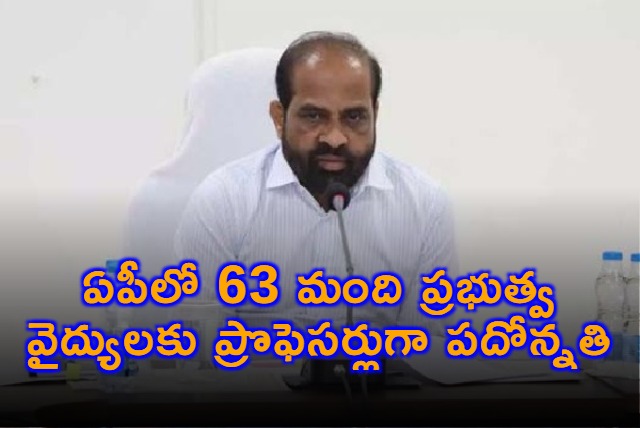 ప్రభుత్వ వైద్య కళాశాలల్లో ప్రొఫెసర్ల కొరతను అధిగమించడానికి ప్రభుత్వం చేపట్టిన చర్యలతో 63 మందికి పదోన్నతి లభించింది. జాతీయ వైద్య సంఘం(ఎన్ఎంసి) నియమాల మేరకు వివిధ కళాశాలల్లో ప్రొఫెసర్ల అవసరాలను తీర్చడానికి ప్రభుత్వం నియమాలను సడలించింది. నిబంధనల మేరకు అసోసియేట్ ప్రొఫెసర్గా మూడేళ్లు పనిచేసిన వారు ప్రొఫెసర్ పదోన్నతికి అర్హులు. దీనిని సడలింపు చేస్తూ...ఒక ఏడాది అనుభవమున్న అసోసియేట్ ప్రొఫెసర్లను ప్రొఫెసర్లుగా నియమించే అవకాశాన్ని ప్రభుత్వం కల్పించింది. ఈ మేరకు 11 క్లినికల్ విభాగాలు, 2 నాన్ క్లినికల్ విభాగాల్లో 63 మందిని డిపిసి(డిపార్ట్మెంటల్ ప్రమోషన్ కమిటీ) పదోన్నతికి సిఫారసు చేసింది. ఈ విధంగా పదోన్నతి పొందిన ప్రొఫెసర్లకు పోస్టింగులిస్తూ వైద్యారోగ్య శాఖ మంత్రి సత్యకుమార్ యాదవ్ నిన్న ఆదేశాలు జారీ చేశారు.