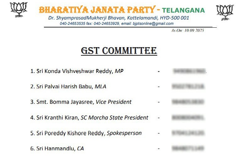 Tue 17:48 తెలంగాణలో జీఎస్టీ కమిటీని నియమించిన బీజేపీ.. ఎందుకంటే? జీఎస్టీపై దృష్టి సారించిన తెలంగాణ బీజేపీ కేంద్రం జీఎస్టీ నిర్ణయాలను ప్రజల్లోకి తీసుకెళ్లడమే కమిటీ లక్ష్యం ఆరుగురు సభ్యులతో ప్రత్యేక కమిటీ నియామకం కమిటీలో ఎంపీ కొండా విశ్వేశ్వర్ రెడ్డి, ఎమ్మెల్యే పాల్వాయి హరీశ్ బాబుకు చోటు Read full story