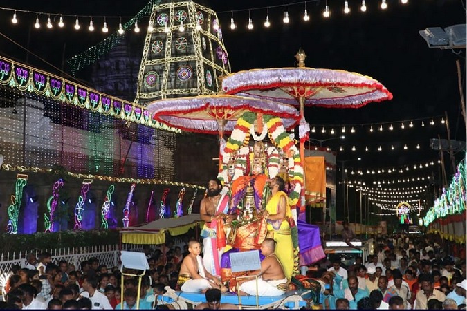 Thu 17:37 తిరుమల శ్రీవారి బ్రహ్మోత్సవాలకు భారీ భద్రతా ఏర్పాట్లు సెప్టెంబరు 24 నుంచి అక్టోబర్ 2 వరకు శ్రీవారి సాలకట్ల బ్రహ్మోత్సవాలు భద్రతా విధుల్లో మొత్తం 4,000 మంది పోలీసుల మోహరింపు గరుడ సేవ రోజు ఘాట్ రోడ్లపై ద్విచక్ర వాహనాల రాకపోకలు బంద్ 4,000 సీసీ కెమెరాలతో తిరుమల, తిరుపతిలో నిరంతర నిఘా విధుల్లో 1,500 మంది టీటీడీ విజిలెన్స్ సిబ్బంది, ఆక్టోపస్ బృందాలు Read full story