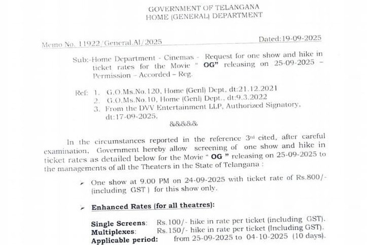 Fri 22:03 తెలంగాణలో పవన్ కల్యాణ్ 'ఓజీ' స్పెషల్ షోకు ప్రభుత్వం అనుమతి.. టికెట్ రేటు ఎంతంటే? పవన్ కల్యాణ్ 'ఓజీ' సినిమాకు తెలంగాణ సర్కార్ ప్రత్యేక అనుమతి విడుదలకు ముందు రోజు రాత్రి స్పెషల్ షోకు గ్రీన్ సిగ్నల్ సెప్టెంబర్ 24న రాత్రి 9 గంటలకు షో ప్రదర్శనకు అవకాశం టికెట్ ధరను రూ. 800 వరకు పెంచుకోవచ్చని వెసులుబాటు పవర్ స్టార్ అభిమానులకు ముందుగానే పండగ వాతావరణం Read full story