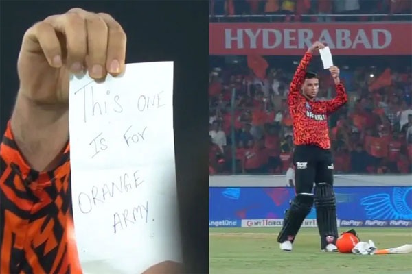 అదే పద్ధతిని ఐపీఎల్ మ్యాచ్‌లోనూ పాటించానని చెప్పాడు. "ఆ రోజు మ్యాచ్‌కు ముందు ఉదయాన్నే ఒక చిన్న కాగితంపై 'దిస్ వన్ ఈజ్ ఫర్ ది ఆరెంజ్ ఆర్మీ' అని రాసుకున్నాను. యాభై పరుగులు చేసినప్పుడు అది గుర్తురాలేదు. కానీ, సెంచరీ పూర్తి కాగానే వెంటనే గుర్తొచ్చింది. అప్పుడు జేబులోంచి తీసి కెమెరాకు చూపించాను" అని అభిషేక్ పేర్కొన్నాడు.