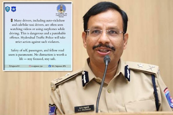 వాహనం నడుపుతూ మొబైల్ ఫోన్‌లో వీడియోలు చూడటం, చెవిలో ఇయర్‌ఫోన్స్ పెట్టుకుని కబుర్లలో మునిగిపోవడం వంటి నిర్లక్ష్యపు డ్రైవింగ్‌కు ఇకపై చెక్ పెట్టాలని హైదరాబాద్ పోలీసులు నిర్ణయించారు. ఇలాంటి ప్రమాదకరమైన చర్యలకు పాల్పడే వారిపై కఠిన చర్యలు తప్పవని నగర పోలీస్ కమిషనర్ సజ్జనార్ తీవ్రంగా హెచ్చరించారు. డ్రైవింగ్‌లో మొబైల్ ఫోన్ వాడటం కేవలం ప్రమాదకరమే కాదని, చట్టప్రకారం శిక్షార్హమైన నేరమని ఆయన స్పష్టం చేశారు.