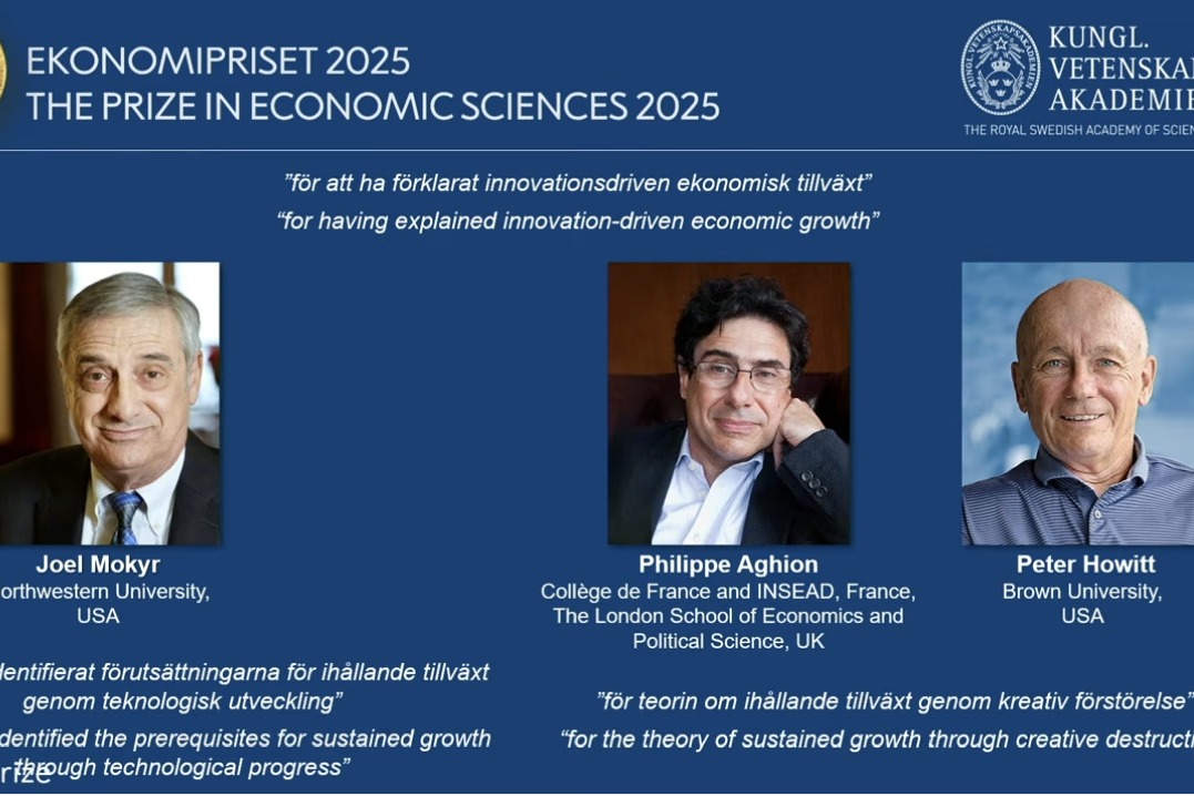 Mon 16:35 ఆర్థిక వృద్ధి రహస్యం ఛేదించారు... అర్థశాస్త్రంలో నోబెల్ బహుమతి ప్రకటన 2025 సంవత్సరానికి అర్థశాస్త్రంలో నోబెల్ బహుమతి ప్రకటన ముగ్గురు ఆర్థికవేత్తలకు సంయుక్తంగా ఈ పురస్కారం జోయెల్ మోకిర్, ఫిలిప్ అగియాన్, పీటర్ హోవిట్ల ఎంపిక ఆవిష్కరణలతో ఆర్థిక వృద్ధిపై చేసిన పరిశోధనలకు గుర్తింపు 'సృజనాత్మక విధ్వంసం' అనే సిద్ధాంతానికి పెద్దపీట Read full story