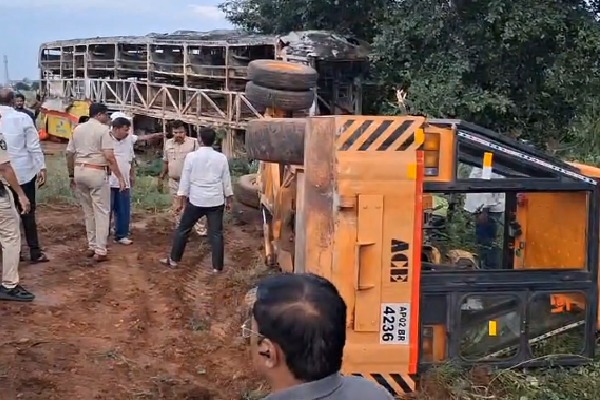 కర్నూలు జిల్లాలో తీవ్ర విషాదాన్ని నింపిన కావేరి బస్సు ప్రమాద స్థలంలో మరో ఘటన చోటుచేసుకుంది. కాలిపోయిన బస్సును రోడ్డు పైనుంచి తొలగిస్తుండగా, దానిని లాగుతున్న క్రేన్ అదుపుతప్పి బోల్తాపడింది. ఈ ప్రమాదంలో క్రేన్ డ్రైవర్కు గాయాలయ్యాయి.