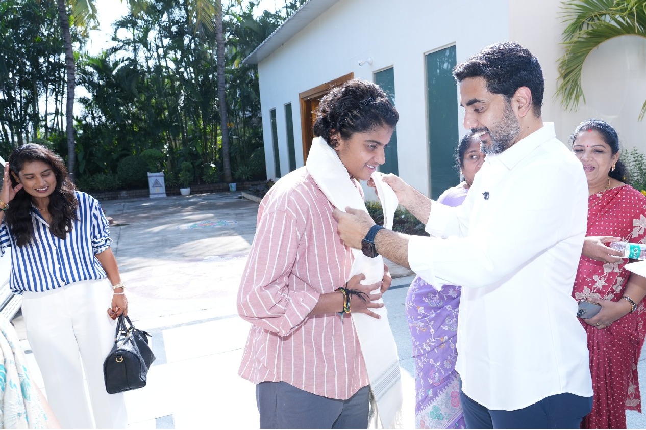 - అమరావతిలోని నివాసంలో ఘనంగా సత్కరించిన సీఎం, మంత్రి లోకేశ్