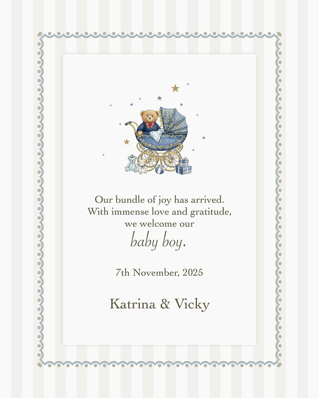 తమకు కుమారుడు జన్మించిన విషయాన్ని ప్రకటిస్తూ విక్కీ-కత్రినా ఒక భావోద్వేగ పోస్ట్ చేశారు. "మా జీవితంలో ఆనందం రెట్టింపు అయింది. అపారమైన ప్రేమ, కృతజ్ఞతతో మా మగబిడ్డను ఈ ప్రపంచంలోకి స్వాగతిస్తున్నాము" అంటూ తమ సంతోషాన్ని వ్యక్తం చేశారు. దీంతో అభిమానులు, సినీ ప్రముఖులు ఈ జంటకు శుభాకాంక్షలు తెలుపుతున్నారు.