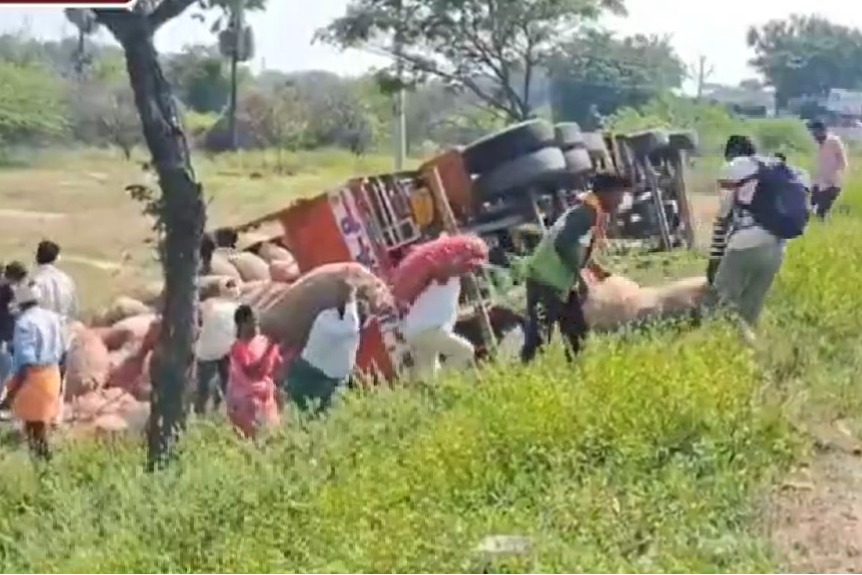 నల్గొండ జిల్లాలో ఉల్లిపాయల లారీ బోల్తా.. బస్తాలను ఎత్తుకెళ్లిన వాహనదారులు