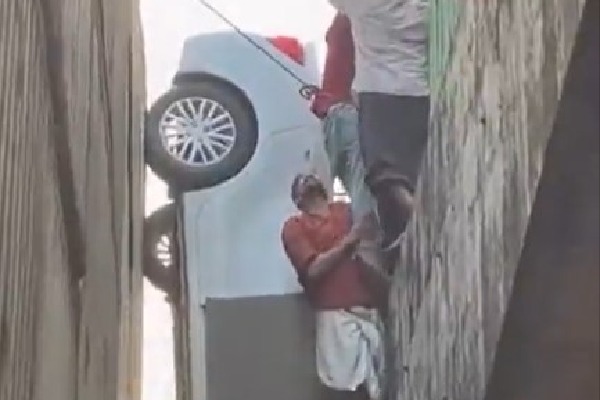 రెండు వంతెన భాగాల మధ్య ఖాళీ ప్రదేశం ఇరుకుగా ఉండటంతో కారు అందులో ఇరుక్కుపోయింది. ప్రమాదకరంగా గాలిలో వేలాడుతున్న కారులోని డ్రైవర్ను స్థానికులు, సహాయక సిబ్బంది సురక్షితంగా వెలుపలికి తీసుకువచ్చారు. కారు డ్రైవర్ పెను ప్రమాదం నుంచి క్షేమంగా బయటపడ్డారని ప్రత్యక్ష సాక్షులు తెలిపారు.