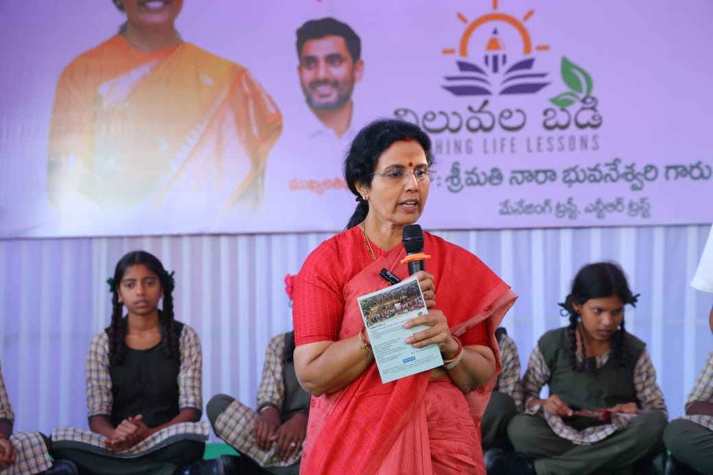 చిన్న వయసులో ఇంటింటికీ వెళ్లి పాలు అమ్మేవారు. ఆ తర్వాత స్కూల్ కి వెళ్లి చదువుకునే వారు. ఎంతోమంది తల్లిదండ్రులు స్థోమత లేకపోయినా వారి శక్తికి మించి పిల్లలను చదివిస్తున్నారు. వారు మీపై పెట్టుకున్న నమ్మకాన్ని నిలబెట్టుకోవాలని విద్యార్థులకు నారా భువనేశ్వరి సూచించారు. అలాగే విద్యార్థులు చదువుతో పాటు క్రీడలపైనా దృష్టి పెట్టాలని, క్రీడల్లో రాణించే విద్యార్థులకు సహాయం చేయటానికి ఎన్టీఆర్ ట్రస్ట్ ఎప్పుడూ ముందుంటుందని అన్నారు. కస్తూర్భా విద్యాలయానికి 20 కంప్యూటర్లు, నర్సింగ్ విద్యార్థులకు అవసరమైన పరికరాలు అందేలా ఏర్పాట్లు చేస్తామని" నారా భువనేశ్వరి హామీ ఇచ్చారు.