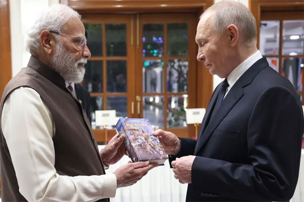 రష్యా అధ్యక్షుడు వ్లాదిమిర్ పుతిన్ రెండు రోజుల భారత పర్యటనకు నిన్న‌ ఢిల్లీ చేరుకున్నారు. ఈ సందర్భంగా ప్రధాని నరేంద్ర మోదీ స్వయంగా పాలం విమానాశ్రయానికి వెళ్లి ఆయనకు ఘన స్వాగతం పలికారు. ఇరువురు నేతలు ఆప్యాయంగా ఆలింగనం చేసుకున్నారు. అనంతరం పుతిన్‌కు రష్యన్ భాషలో అనువదించిన పవిత్ర గ్రంథం 'భగవద్గీత'ను మోదీ బహూకరించారు.