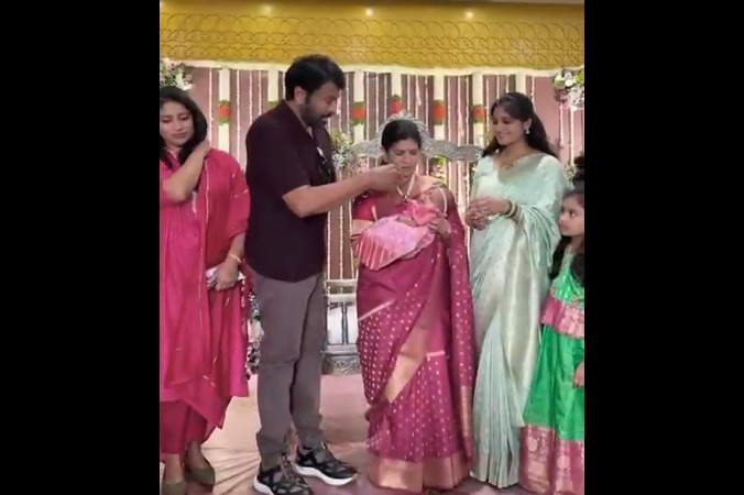 మెగాస్టార్ చిరంజీవి తన మేనేజర్ స్వామినాథ్ కుమార్తె నామకరణ వేడుకకు ఆయన సతీసమేతంగా హాజరై సందడి చేశారు. చిరంజీవి, సురేఖ దంపతులు ఈ కార్యక్రమానికి విచ్చేసి చిన్నారిని మనసారా ఆశీర్వదించారు. స్వామినాథ్ కుటుంబ సభ్యులతో కలిసి ఆప్యాయంగా మాట్లాడారు. ఇందుకు సంబంధించిన వీడియో ప్రస్తుతం సామాజిక మాధ్యమాల్లో వైరల్గా మారింది. స్టార్ హీరో అయినప్పటికీ తన సిబ్బంది కుటుంబ వేడుకకు హాజరైన చిరంజీవి నిరాడంబరతను అభిమానులు, నెటిజన్లు ప్రశంసిస్తున్నారు.
