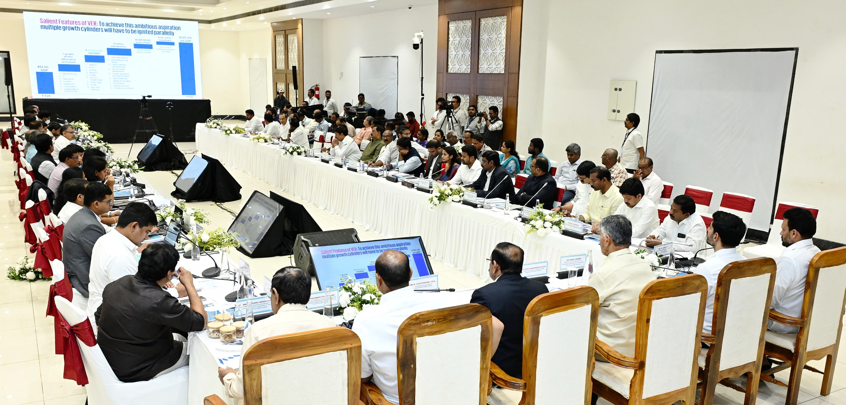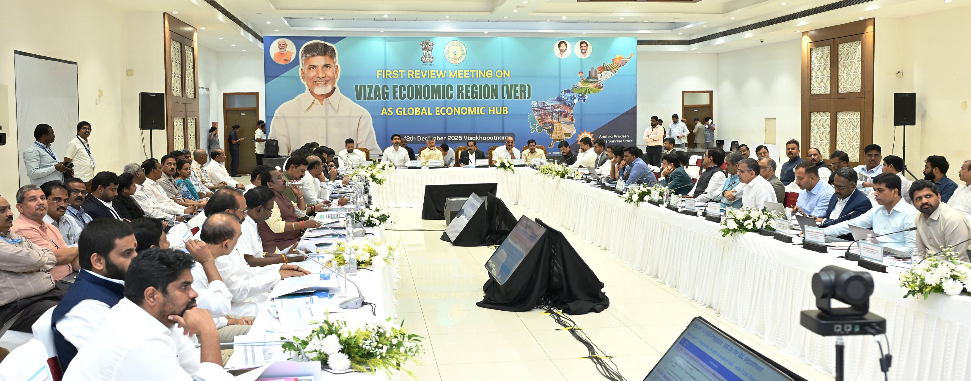 వీఈఆర్ పరిధిలో ప్రస్తుతం కొనసాగుతున్న, కొత్తగా చేపట్టాల్సిన రైల్వే ప్రాజెక్టులు, జాతీయ రహదారుల నిర్మాణంపైనా ప్రత్యేకంగా చర్చించారు. మౌలిక వసతుల కల్పనకు అత్యంత ప్రాధాన్యత ఇవ్వాలని, తద్వారా పారిశ్రామిక, వాణిజ్య కార్యకలాపాలు వేగవంతం అవుతాయని సీఎం అభిప్రాయపడ్డారు. ఈ కీలక సమావేశంలో మంత్రులు నారా లోకేశ్, అచ్చెన్నాయుడు, పి. నారాయణ, టీజీ భరత్, కందుల దుర్గేష్, కొండపల్లి శ్రీనివాస్, డోలా బాల వీరాంజనేయ స్వామి, కొల్లు రవీంద్ర... 9 జిల్లాల కలెక్టర్లు, పలువురు ఉన్నతాధికారులు పాల్గొన్నారు.
