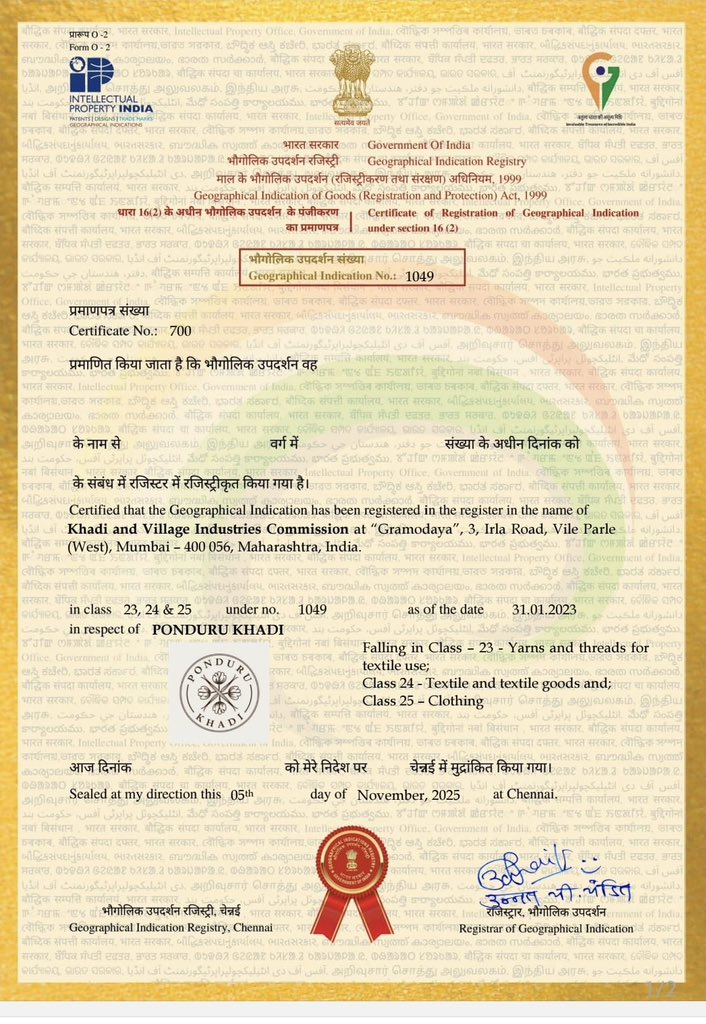 - పొందూరు ఖాదీకి ప్రతిష్ఠాత్మక జీఐ ట్యాగ్ గుర్తింపు