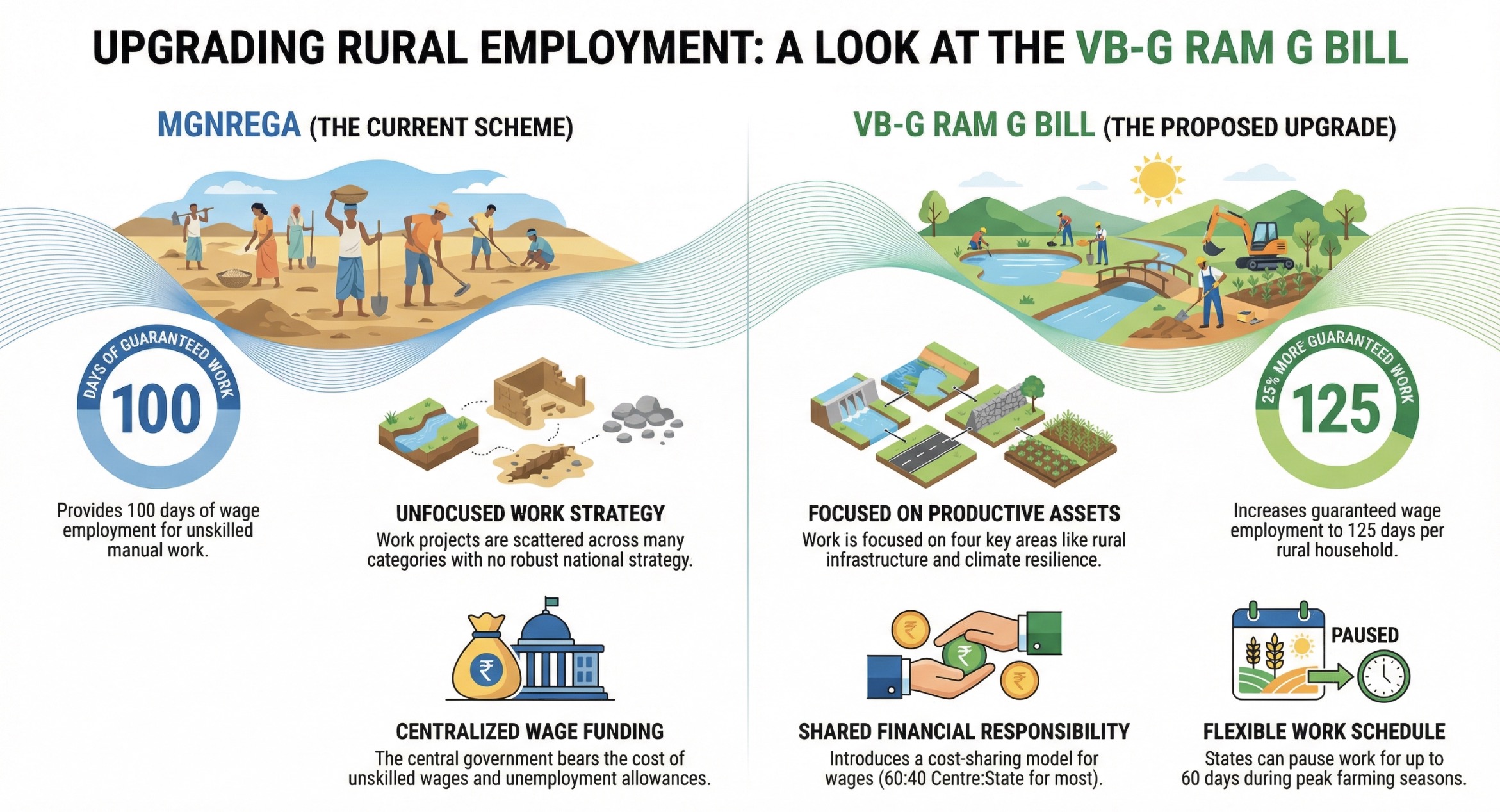 పాత చట్టం స్థానంలో కొత్త వ్యవస్థ ఎందుకు?ఉపాధి హామీ చట్టం ద్వారా గ్రామీణ ప్రాంతాల్లో ఉపాధి అవకాశాలు మెరుగుపడినప్పటికీ, దాని అమలులో అనేక నిర్మాణాత్మక లోపాలు ఉన్నాయని కేంద్రం భావిస్తోంది. నిధుల దుర్వినియోగం, డిజిటల్ హాజరును పక్కదారి పట్టించడం, చేపట్టిన పనులకు, పెట్టిన ఖర్చుకు పొంతన లేకపోవడం వంటి సమస్యలు వ్యవస్థను బలహీనపరిచాయని పేర్కొంది. ఈ నేపథ్యంలోనే పాత చట్టాన్ని రద్దు చేసి, మరింత ఆధునిక, పారదర్శక విధానాలతో కూడిన కొత్త చట్టాన్ని తీసుకురావాల్సిన అవసరం ఏర్పడిందని వివరించింది.