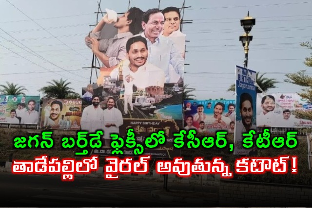 వైసీపీ అధినేత జగన్ రేపు పుట్టినరోజును జరుపుకోబోతున్నారు. ఈ సందర్భంగా ఆయన నివాసం ఉండే తాడేపల్లిలో పెద్ద ఎత్తున ఫ్లెక్సీలు ఏర్పాటు చేశారు. వాటిలో ఓ కటౌట్ ఇప్పుడు రాజకీయ వర్గాల్లో ఆసక్తికర చర్చకు దారితీసింది. ఈ కటౌట్లో తెలంగాణ మాజీ ముఖ్యమంత్రి కేసీఆర్, ఆయన తనయుడు కేటీఆర్ కనిపించడమే దీనికి కారణం.