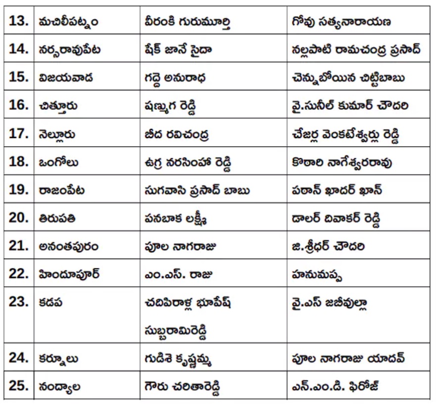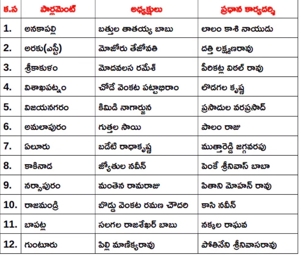 టీడీపీ లోక్సభ నియోజకవర్గ (జిల్లా) అధ్యక్ష, ప్రధాన కార్యదర్శులను పార్టీ అధినేత చంద్రబాబు ఎంపిక చేశారు. ఎంపికైన నేతల పేర్ల జాబితాను టీడీపీ అధికారికంగా ప్రకటించింది. పార్టీ కోసం క్షేత్రస్థాయిలో అంకితభావంతో కష్టపడుతున్న కార్యకర్తలకు ఈ ఎంపికలో ప్రాధాన్యం ఇచ్చినట్లు చంద్రబాబు పేర్కొన్నారు. అభ్యర్థుల సామర్థ్యంతో పాటు సామాజిక సమీకరణాలు, సీనియారిటీ, విధేయత తదితర అంశాలను పరిగణనలోకి తీసుకున్నట్లు చెప్పారు.