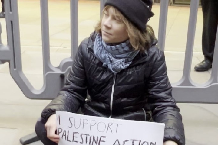 - 'పాలస్తీనా యాక్షన్' అనే సంస్థ ప్లకార్డును పట్టుకుని నిరసన