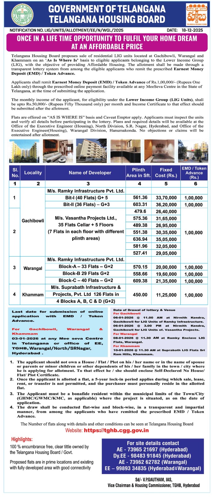 హౌసింగ్ బోర్డ్ వైస్ ఛైర్మన్, కమిషనర్ వి.పి. గౌతమ్ తెలిపిన వివరాల ప్రకారం.. గచ్చిబౌలిలో 111, వరంగల్లోని రాంకీ ఎన్క్లేవ్లో 102, ఖమ్మంలోని శ్రీరామ్ హిల్స్లో 126 ఫ్లాట్లు అందుబాటులో ఉన్నాయి. "ఈ ఫ్లాట్లన్నీ గేటెడ్ కమ్యూనిటీలలో ఉన్నాయి. ఇప్పటికే చాలా కుటుంబాలు నివసిస్తున్నాయి. తక్కువ ఆదాయ వర్గాల వారికి నాణ్యమైన గృహ వసతి కల్పించాలనే లక్ష్యంతో వీటిని కేటాయిస్తున్నాం" అని ఆయన వివరించారు.