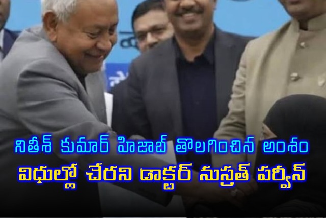బీహార్ ముఖ్యమంత్రి నితీశ్ కుమార్ ఇటీవల ఉద్యోగ నియమక పత్రాల పంపిణీ సమయంలో ఒక మహిళ హిజాబ్ను తొలగించే ప్రయత్నం చేసిన విషయం విదితమే. ఈ ఘటనతో ఇబ్బందిపడిన ఆయుష్ వైద్యురాలు సుస్రత్ పర్వీన్, నేటితో గడువు ముగిసినప్పటికీ ఇంకా పోస్టింగ్లో చేరలేదని అధికారులు చెబుతున్నారు. నియామక పత్రాలు అందుకున్న ఆయుష్ వైద్యులు పోస్టింగ్లో చేరడానికి డిసెంబర్ 31 వరకు గడువు ఇచ్చారు.