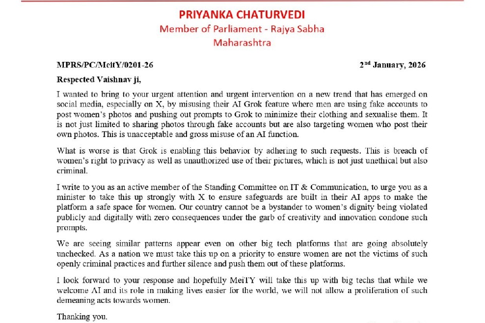 Fri 20:17 'గ్రోక్'తో మహిళల మార్ఫింగ్ ఫొటోలు.. కేంద్రమంత్రికి ఎంపీ ప్రియాంక చతుర్వేది ఫిర్యాదు మహిళ ఫొటోను అశ్లీలంగా మార్చాలని ప్రాంప్ట్ ఇస్తే సమాధానం ఇస్తున్న 'గ్రోక్' మహిళల గోప్యతకు సంబంధించిన ఈ అంశంపై కేంద్రం జోక్యం చేసుకోవాలన్న శివసేన ఎంపీ కేంద్ర మంత్రి అశ్వినీ వైష్ణవ్కు లేఖ రాసిన ప్రియాంక చతుర్వేది Read full story