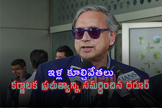 బెంగళూరులో కర్ణాటక ప్రభుత్వం చేపట్టిన ఇళ్ల కూల్చివేతలపై కాంగ్రెస్ పార్టీకి చెందిన తిరువనంతపురం ఎంపీ శశిథరూర్ స్పందించారు. ఉత్తర బెంగళూరులోని కోగిలు ప్రాంతంలోని వసీ లేఅవుట్, ఫకీర్ కాలనీలలో ప్రభుత్వం ఇళ్ల కూల్చివేత కార్యక్రమాన్ని చేపట్టింది. ఈ కూల్చివేతలను శశిథరూర్ సమర్థించారు. ఇవి చట్టపరమైన విధానాలకు లోబడే జరుగుతున్నాయని, నిర్వాసితులకు ప్రత్యామ్నాయ ఏర్పాట్లు కూడా ప్రభుత్వం చేస్తుందని ఆయన వెల్లడించారు.