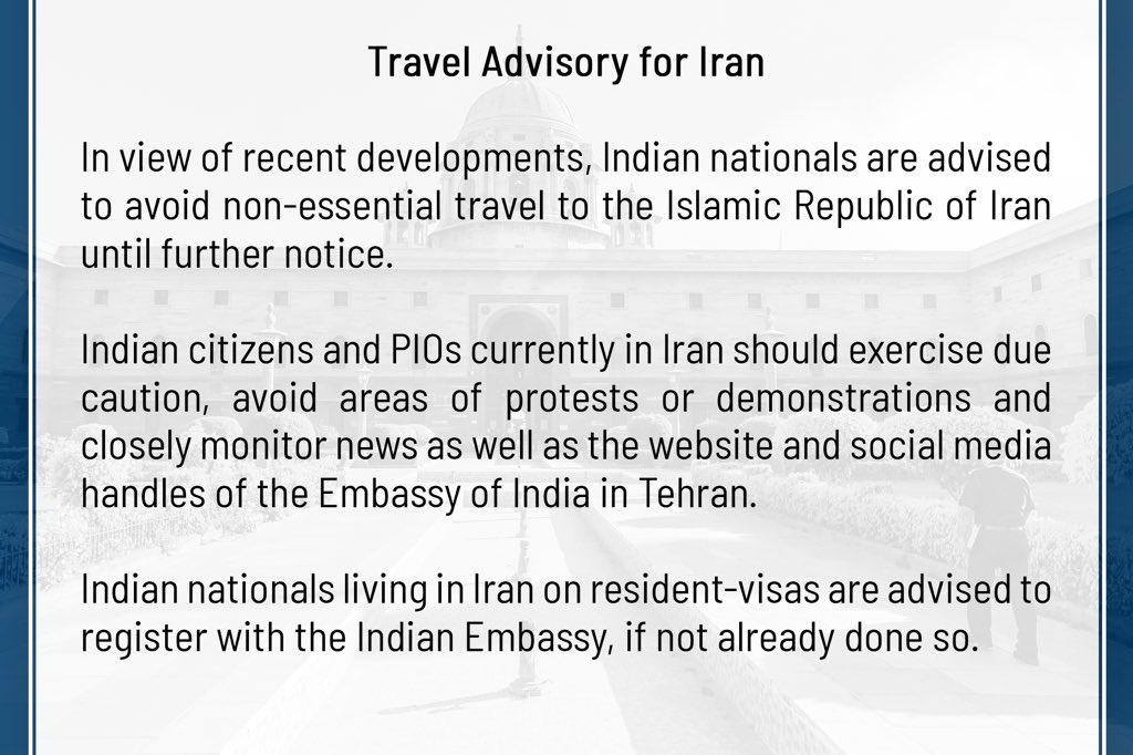 Mon 21:41 ఇరాన్లో ఆర్థిక సంక్షోభం... ట్రావెల్ అడ్వైజరీ జారీ చేసిన భారత్ తదుపరి నోటీసు వచ్చే వరకు ఇరాన్కు అనవసర ప్రయాణాలు వద్దని సూచన నిరసన జరిగే ప్రాంతాలకు దూరంగా ఉండాలన్న విదేశాంగ మంత్రిత్వ శాఖ ఇరాన్లోని భారతీయ పౌరులు తగిన జాగ్రత్తలు తీసుకోవాలని సూచన Read full story