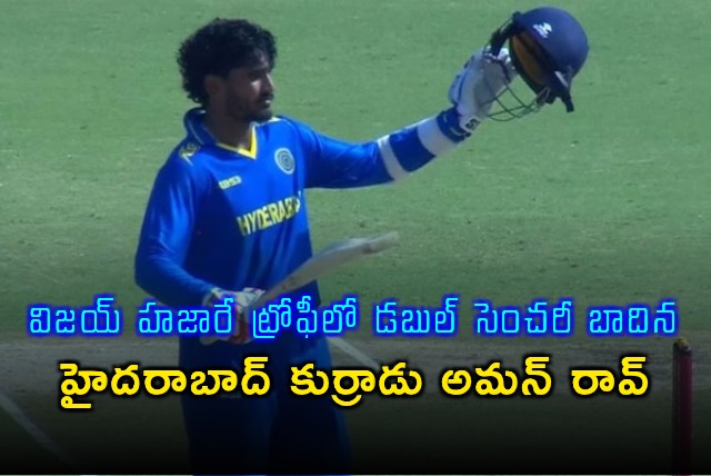 విజయ్ హజారే ట్రోఫీలో హైదరాబాద్ యువ బ్యాటర్ అమన్ రావ్ పేరాల సంచలనం సృష్టించాడు. బెంగాల్తో జరిగిన మ్యాచ్లో ఆకాశమే హద్దుగా చెలరేగి డబుల్ సెంచరీతో కదం తొక్కాడు. నిరంజన్ షా స్టేడియంలో జరిగిన ఈ మ్యాచ్లో తాను ఆడుతున్న మూడో లిస్ట్ ఏ మ్యాచ్లోనే ఈ అద్భుత ఘనతను సాధించడం విశేషం.