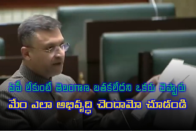 ఆంధ్రప్రదేశ్ లేకుండా తెలంగాణ మనుగడ సాగించలేదని పన్నెండేళ్ల క్రితం ఒక నాయకుడు వ్యాఖ్యానించారని, అయితే ఈ కాలంలో తెలంగాణ ఎంతగా అభివృద్ధి చెందిందో చూడాలని మజ్లిస్ పార్టీ శాసనసభా పక్ష నేత అక్బరుద్దీన్ ఒవైసీ అన్నారు. తాము లేకుంటే తెలంగాణకు విద్యుత్ ఉండదని ఉమ్మడి ఆంధ్రప్రదేశ్ చివరి ముఖ్యమంత్రి పేర్కొన్నారని ఆయన గుర్తు చేశారు. తెలంగాణ రాష్ట్రం ఏర్పడితే నీళ్లు, విద్యుత్ ఉండవని చెప్పారని తెలిపారు.